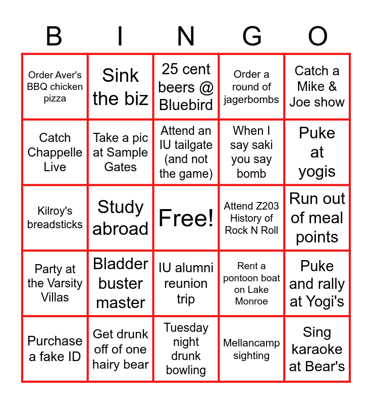 This bingo card has a free space and 39 words: Grab a sandwich at Dagwood's, Pass the flambongo, Request "This is Indiana" at a wedding, Take a pic at Sample Gates, Purchase a fake ID, IU alumni reunion trip, Attend an IU tailgate (and not the game), Beer sweats in class, Catch a Mike & Joe show, Party at the Varsity Villas, Study abroad, Order a round of jagerbombs, Sing karaoke at Bear's, Run out of meal points, Attend Z203 History of Rock N Roll, Bladder buster master, Catch a bball game at Assembly Hall, Order Aver's BBQ chicken pizza, Swim in the mermaid fountain, Rent a pontoon boat on Lake Monroe, Catch Chappelle Live, Tuesday night drunk bowling, When I say saki you say bomb, Puke at yogis, Fall on your face walking home from the bars, Oliver winery field trip, Order an extra side of ranch, Catch the last drunk bus, Fail to complete a power hour, Sink the biz, Little 5 slip n slide, Steal a Scotty's pint glass, 25 cent beers @ Bluebird, Get drunk off of one hairy bear, Mellancamp sighting, Dominate a flip cup tournament, Puke and rally at Yogi's, Kilroy's breadsticks and Jiffy Treat delivery.