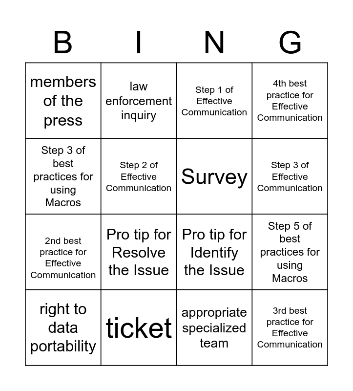This bingo card has 16 words: ticket, Step 5 of best practices for using Macros, Step 1 of Effective Communication, members of the press, 2nd best practice for Effective Communication, law enforcement inquiry, Pro tip for Identify the Issue, appropriate specialized team, Step 3 of best practices for using Macros, Step 2 of Effective Communication, right to data portability, 4th best practice for Effective Communication, Pro tip for Resolve the Issue, Step 3 of Effective Communication, Survey and 3rd best practice for Effective Communication.