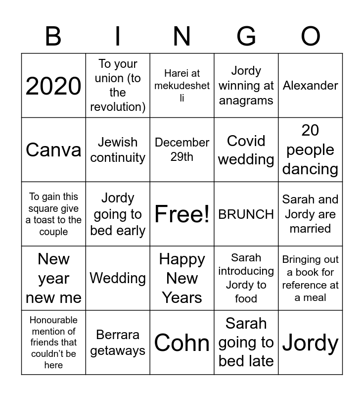 This bingo card has a free space and 48 words: Sarah, Jordy, Charak, Cohn, Wedding, Marriage, To your union (to the revolution), Law, Canva, Bnei relationships, Jewish continuity, Jordy winning at anagrams, Bringing out a book for reference at a meal, Sarah introducing Jordy to food, That trip in Europe, Camping trip engagement, December 29th, BRUNCH, Edith, Alexander, Jordy going to bed early, Sarah going to bed late, 2020, Covid wedding, Thank God for livestreams, 20 people dancing, Honourable mention of friends that couldn’t be here, Shoshana is the third wheel, Happy New Years, New year new me, We Love Bnei, Jordan, Jordyandsarah.com, Sarah doesn’t have Instagram, Berrara getaways, Siblings or dating (check out their insta), Sarah and Jordy’s wedding speech, Sarah and Jordy are married, Netball nights, Garlic bread, Deckhouse in the rain is a vibe, Ani L’Dodi V’Dodi Li, Harei at mekudeshet li, Yay, lets celebrate, To gain this square give a toast to the couple, Sheva brachot, Vegetarian and You can see Jordy’s house from Sarah’s bedroom.