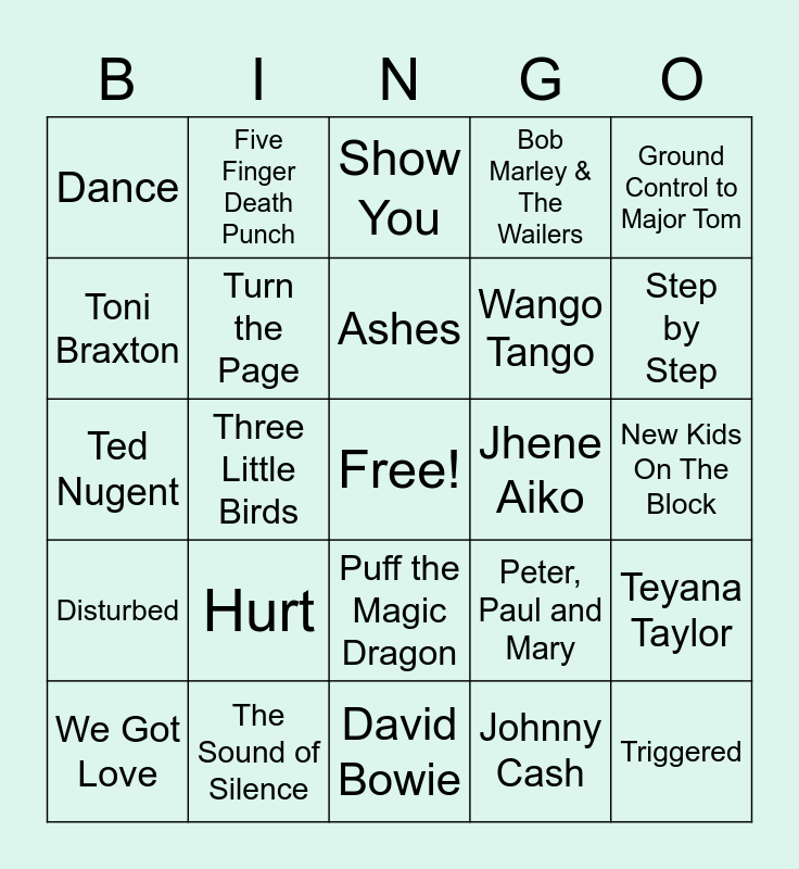 This bingo card has a free space and 26 words: Puff the Magic Dragon, Johnny Cash, Ashes, The Sound of Silence, Ground Control to Major Tom, Dance, Toni Braxton, Five Finger Death Punch, New Kids On The Block, Peter, Paul and Mary, Wango Tango, Ted Nugent, Teyana Taylor, We Got Love, Three Little Birds, Baby Rose, Bob Marley & The Wailers, Disturbed, Show You, Triggered, Step by Step, David Bowie, Jhene Aiko, Hurt, Turn the Page and Metallica.