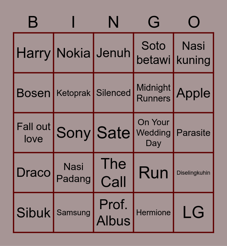 This bingo card has a free space and 24 words: Nasi Padang, Samsung, Silenced, Sibuk, Nasi kuning, Harry, Bosen, Nokia, On Your Wedding Day, The Call, Midnight Runners, Fall out love, Run, Diselingkuhin, Ketoprak, Hermione, Parasite, Jenuh, Apple, Sony, LG, Draco, Soto betawi and Prof. Albus.