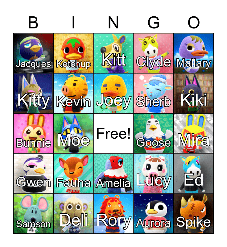 This bingo card has 24 images, a free space and 24 words: Fauna, Deli, Joey, Samson, Mallary, Jacques, Kitty, Ketchup, Goose, Amelia, Sherb, Bunnie, Lucy, Ed, Kevin, Aurora, Mira, Kitt, Kiki, Moe, Spike, Gwen, Clyde and Rory.