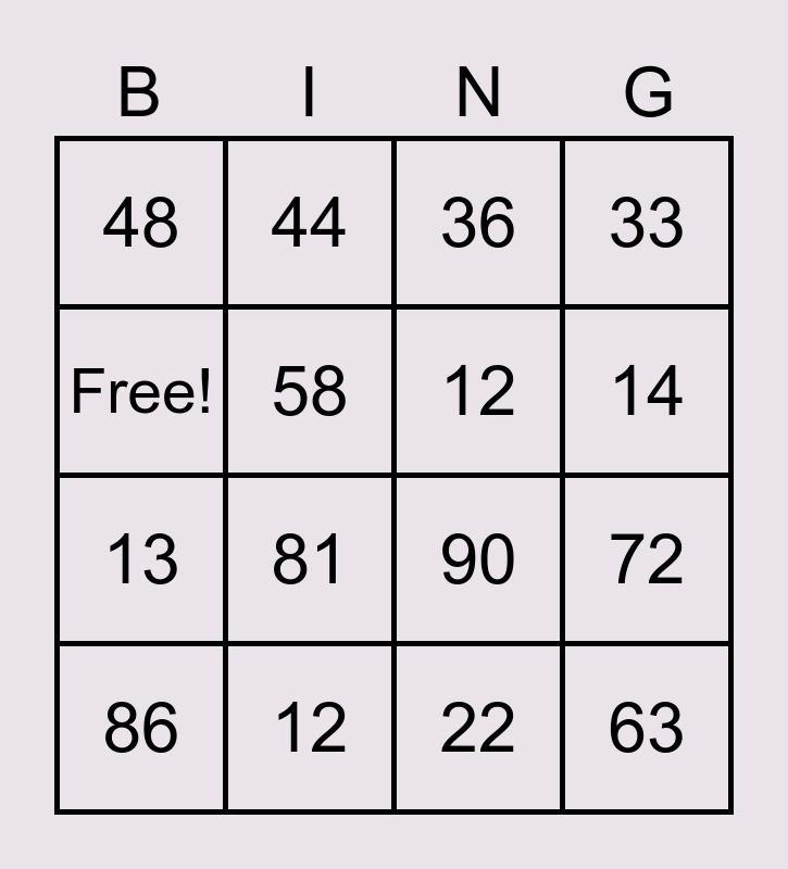 This bingo card has 16 words: 12, 72, 36, 48, 13, 44, 90, 22, Free!, 58, 86, 33, 81, 14, 12 and 63.