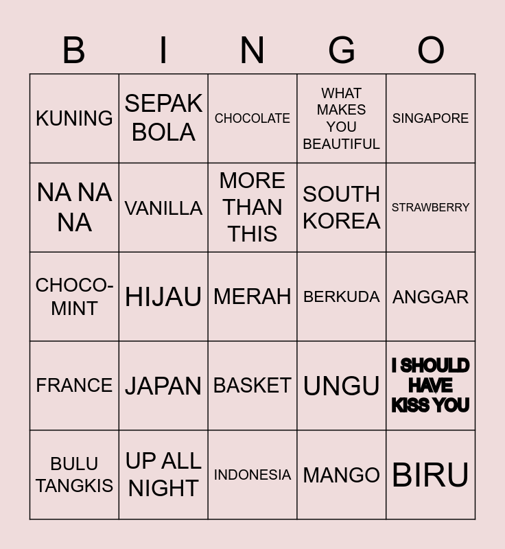 This bingo card has 25 words: FRANCE, UP ALL NIGHT, MERAH, MANGO, SINGAPORE, KUNING, SEPAK BOLA, CHOCOLATE, BERKUDA, I SHOULD HAVE KISS YOU, NA NA NA, VANILLA, INDONESIA, UNGU, STRAWBERRY, BULU TANGKIS, HIJAU, MORE THAN THIS, SOUTH KOREA, ANGGAR, CHOCO-MINT, JAPAN, BASKET, WHAT MAKES YOU BEAUTIFUL and BIRU.