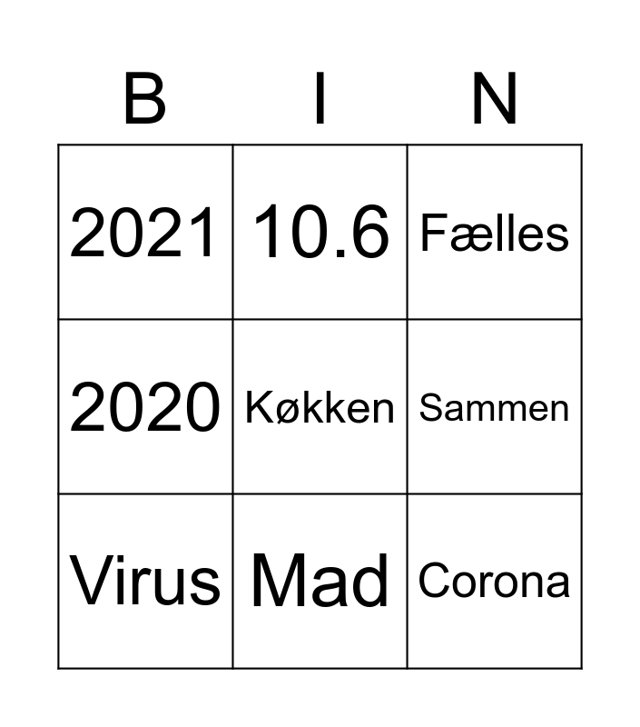 This bingo card has 12 words: Nytår!, Corona, Køkken, Sammen, 10.6, Fælles, Mad, Skål, 2021, 2020, Virus and Fest.