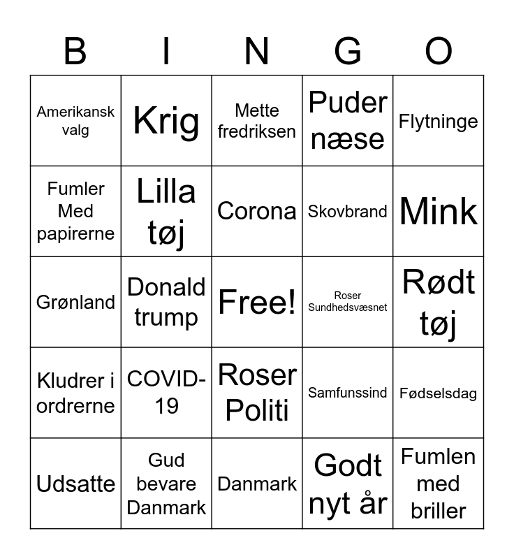 This bingo card has a free space and 25 words: COVID-19, Danmark, Corona, Udsatte, Flytninge, Amerikansk valg, Fumler Med papirerne, Krig, Roser Sundhedsvæsnet, Roser Politi, Skovbrand, Grønland, Samfunssind, Fødselsdag, Lilla tøj, Grønt tøj, Rødt tøj, Mette fredriksen, Mink, Donald trump, Fumlen med briller, Gud bevare Danmark, Kludrer i ordrerne, Puder næse and Godt nyt år.