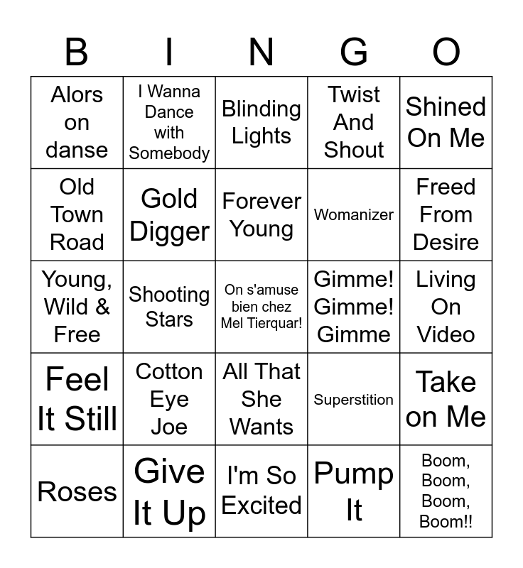 This bingo card has a free space and 66 words: Mambo No. 5, Wake Me Up Before You Go-Go, Africa, Take on Me, Crazy In Love, Karma Chameleon, I Wanna Dance with Somebody, Believe, Forever Young, Flashdance, All That She Wants, I'm Coming Out, Living On Video, Shined On Me, Like Glue, Old Town Road, Shooting Stars, Alors on danse, 99 Luftballons, Womanizer, Cotton Eye Joe, Feel It Still, Twist And Shout, Wannabe, 7 Days, Kids, Tubthumping, Heads Will Roll, Boom, Boom, Boom, Boom!!, Sultans Of Swing, Roses, Rhythm Is A Dancer, Without Me, Le Freak, Superstition, Give It Up, Don't You Want Me, Young, Wild & Free, Pump It, Hollaback Girl, Gold Digger, Love Generation, Gimme! Gimme! Gimme, We Are Your Friends, The Bomb, Shined On Me, Freed From Desire, Murder On The Dancefloor, You Can't Hurry Love, I Want You Back, Rock Your Body, Tamacun, Derniere danse, Il jouait du piano debout, Trois nuits par semaine, J't'emmene au vent, Chanson pour l'Auvergnat, Tchoin, Blinding Lights, I'm So Excited, Prière païenne, Call on Me, Rasputin, Stayin' Alive, Call on Me and La tribu de Dana.