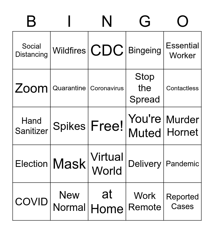 This bingo card has a free space and 24 words: Mask, New Normal, Coronavirus, COVID, Essential Worker, Social Distancing, Zoom, Wildfires, You're Muted, Virtual World, Stop the Spread, Hand Sanitizer, Delivery, Pandemic, Quarantine, Work Remote, Murder Hornet, CDC, Contactless, Spikes, Reported Cases, Election, Bingeing and at Home.