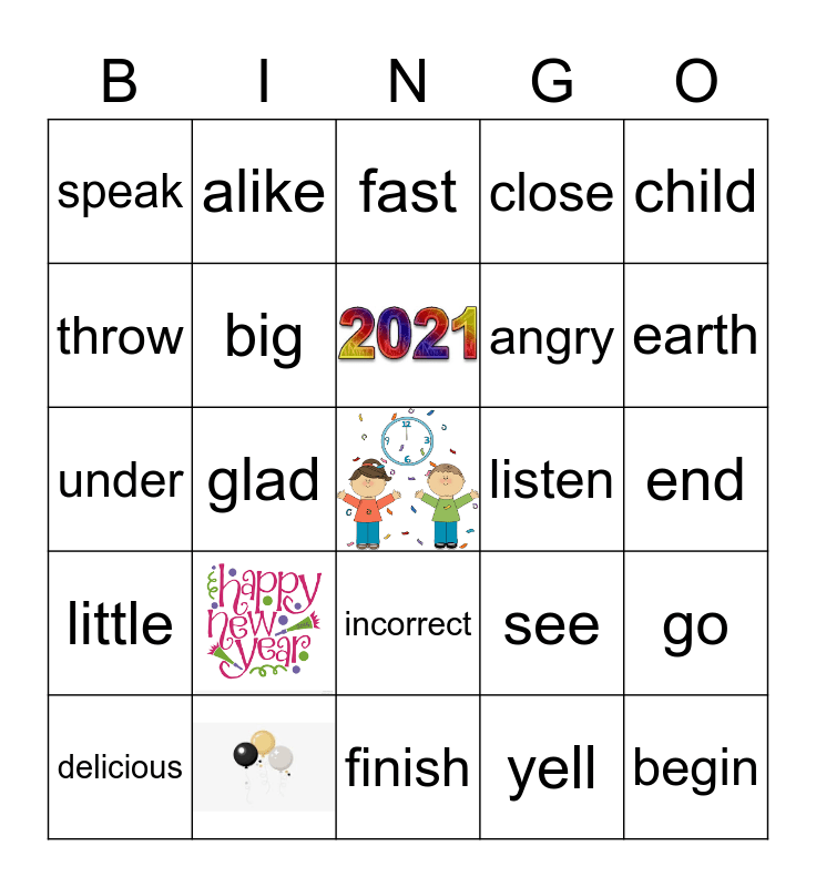 This bingo card has 3 images, a free space and 21 words: delicious, child, speak, throw, alike, listen, incorrect, angry, under, see, go, big, yell, end, fast, earth, glad, begin, little, close and finish.