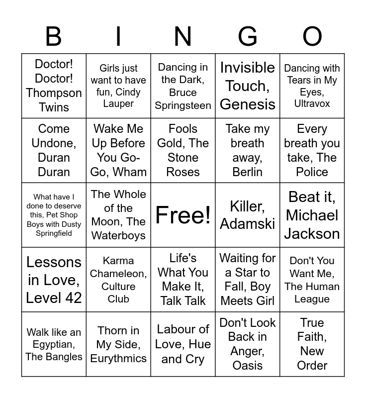 This bingo card has a free space and 72 words: I wanna dance with somebody, Whitney Houston,, Girls just want to have fun, Cindy Lauper, The Whole of the Moon, The Waterboys, Cuddly Toy, Roachford, Happy Hour, House Martins, Hungry Eyes, Eric Carmen, Invisible Touch, Genesis, China in Your Hand, T'Pau, Take my breath away, Berlin, Pump up the Volume, M/A/R/R/S, Walk like an Egyptian, The Bangles, Graceland, Paul Simon, Every breath you take, The Police, Doctor! Doctor! Thompson Twins, Tarzan Boy, Baltimora, What have I done to deserve this, Pet Shop Boys with Dusty Springfield, Waiting for a Star to Fall, Boy Meets Girl, Dancing with Tears in My Eyes, Ultravox, Through the Barricades, Spandau Ballet, Beat it, Michael Jackson, Karma Chameleon, Culture Club, True Faith, New Order, Don't You Want Me, The Human League, The Rhythm of the Night, Corona, Sit Down, James, Friday I'm in Love, The Cure, Let's Dance, David Bowie, Open Your Heart, Madonna, Rhythm is A Dancer, SNAP!, New Sensation, INXS, Thorn in My Side, Eurythmics, Kayleigh, Marrillion, I Want To Break Free, Queen, Sledgehammer, Peter Gabriel, Don't Look Back in Anger, Oasis, Take on Me, Aha, Pump Up the Jam, Technotronic, Livin' On a Prayer, Bon Jovi, Come Undone, Duran Duran, Alive and Kicking, Simple Minds, Life's What You Make It, Talk Talk, Johnny Come Home, Fine Young Cannibals, 1999, Prince, Love Shack, The B-52s, Relight My Fire, Take That (feat. Lulu), Lessons in Love, Level 42, Pass the Dutchie, Musical Youth, Babooshka, Kate Bush, It Must Be Love, Madness, Come On Eileen, Dexys Midnight Runners, The Way It Is, Bruce Hornsby, Gonna Make You Sweat (Everybody Dance Now), C & C Music Factory, All Out of Love, Air Supply, Killer, Adamski, Funky Town, Lipps Inc, The Power of Love, Frankie Goes to Hollywood, Dancing in the Dark, Bruce Springsteen, Fools Gold, The Stone Roses, Dignity, Deacon Blue, Right in the Night (Fall in Love with Music) Jam & Spoon, Town Called Malice, The Jam, Mad World, Tears For Fears, Run To You, Bryan Adams, Labour of Love, Hue and Cry, 19, Paul Hardcastle, Rain or Shine, Five Star, Wake Me Up Before You Go-Go, Wham, There's No Other Way, Blur, One, U2, Let me Love You for Tonight, Kariya, Broken Wings, Mister Mister and Shiny Happy People, REM.