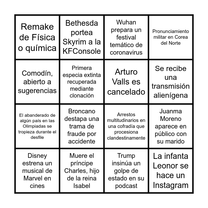 This bingo card has 16 words: Muere el príncipe Charles, hijo de la reina Isabel, Juanma Moreno aparece en público con su marido, Wuhan prepara un festival temático de coronavirus, Remake de Física o química, El abanderado de algún país en las Olimpiadas se tropieza durante el desfile, Bethesda portea Skyrim a la KFConsole, Arrestos multitudinarios en una cofradía que procesiona clandestinamente, Trump insinúa un golpe de estado en su podcast, Comodín, abierto a sugerencias, Primera especia extinta recuperada mediante clonación, Disney estrena un musical de Marvel en cines, Pronunciamiento militar en Corea del Norte, Broncano destapa una trama de fraude por accidente, Se recibe una transmisión alienígena, Arturo Valls es cancelado and La infanta Leonor se hace un Instagram.