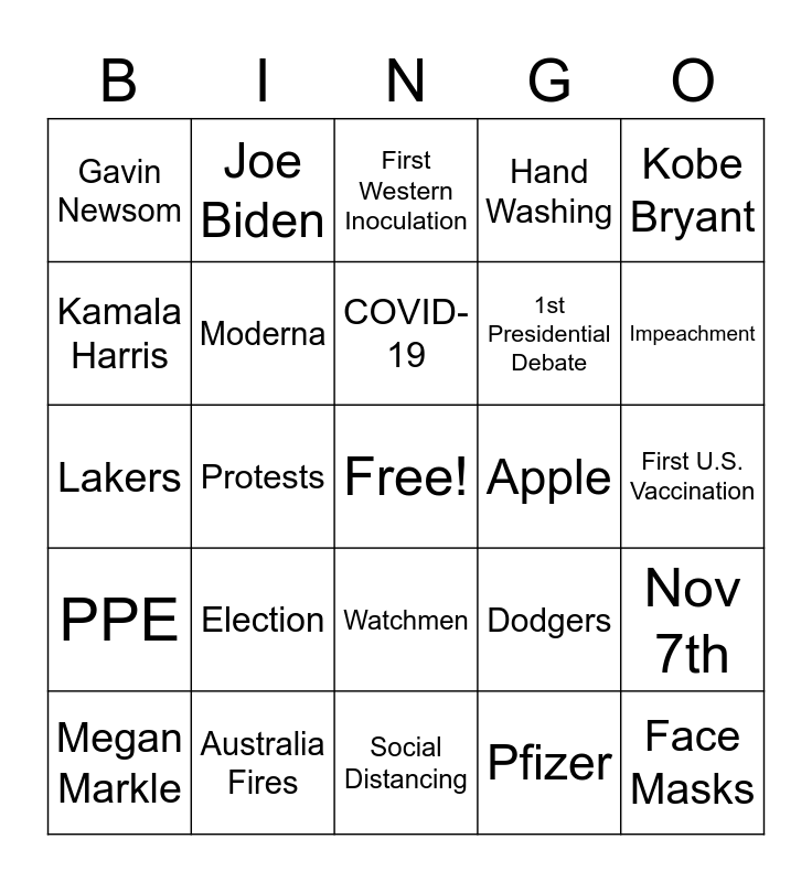 This bingo card has a free space and 24 words: Election, Australia Fires, COVID-19, Megan Markle, Kobe Bryant, Gavin Newsom, Kamala Harris, Joe Biden, Apple, Watchmen, 1st Presidential Debate, Lakers, Dodgers, Nov 7th, Moderna, Pfizer, First U.S. Vaccination, First Western Inoculation, Impeachment, Protests, Face Masks, PPE, Hand Washing and Social Distancing.