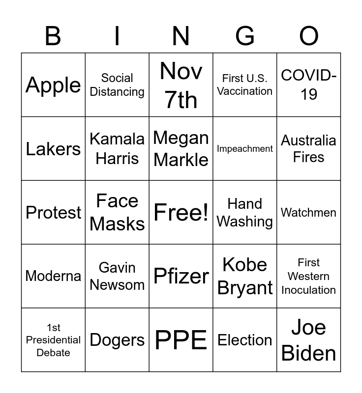 This bingo card has a free space and 24 words: Gavin Newsom, Dogers, Megan Markle, 1st Presidential Debate, COVID-19, Apple, Lakers, Social Distancing, Hand Washing, Pfizer, Impeachment, Protest, Kobe Bryant, First Western Inoculation, Kamala Harris, Election, Watchmen, Nov 7th, Australia Fires, Face Masks, Joe Biden, Moderna, First U.S. Vaccination and PPE.