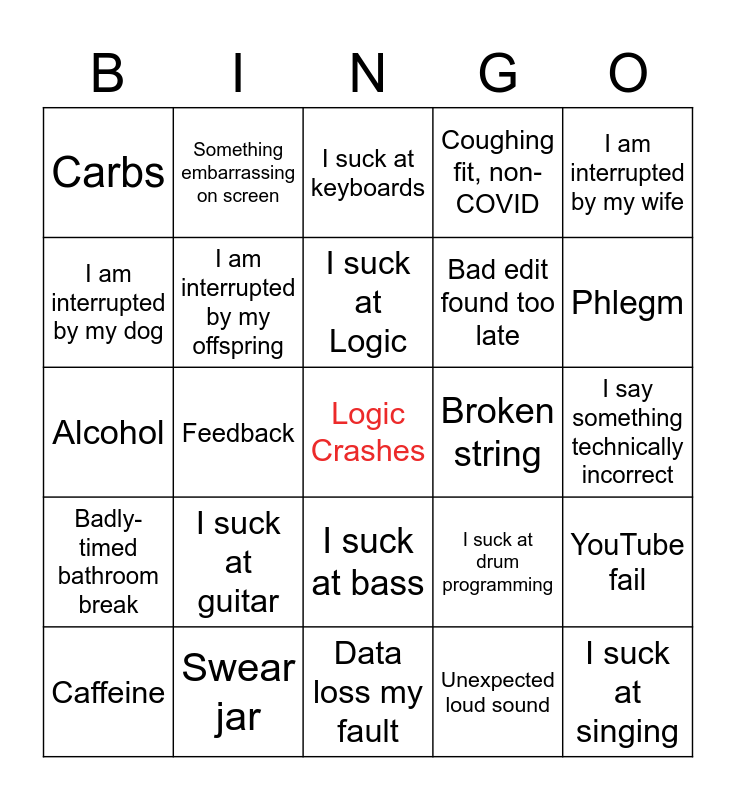 This bingo card has a free space and 24 words: I suck at guitar, Swear jar, I suck at Logic, Caffeine, I am interrupted by my wife, Carbs, I am interrupted by my dog, Something embarrassing on screen, Broken string, I suck at bass, Bad edit found too late, Alcohol, I suck at drum programming, YouTube fail, I am interrupted by my offspring, Unexpected loud sound, I say something technically incorrect, I suck at keyboards, Phlegm, Feedback, I suck at singing, Badly-timed bathroom break, Coughing fit, non-COVID and Data loss my fault.