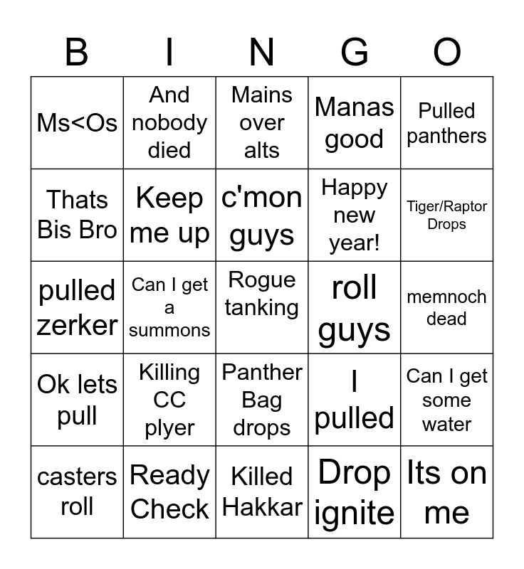 This bingo card has 34 words: Its on me, Drop ignite, Dont Kill (CC player), I fell, Ok lets pull, Keep me up, Pulled panthers, casters roll, And nobody died, stay left, c'mon guys, Mains over alts, Stack on square, Wiped, roll guys, Tiger/Raptor Drops, Ready Check, pulled zerker, Killing CC plyer, I pulled, Panther Bag drops, Taunted, Ms<Os, memnoch dead, Killed Hakkar, Rogue tanking, Manas good, Oom, Happy new year!, Thats Bis Bro, Can I have a HS, Can I get a summons, Can I get some water and Someones locked from Raptor boss.