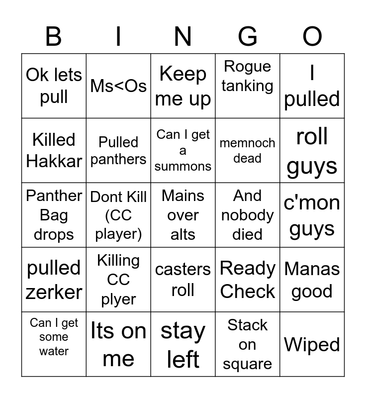 This bingo card has 30 words: Its on me, Drop ignite, Dont Kill (CC player), I fell, Ok lets pull, Keep me up, Pulled panthers, casters roll, And nobody died, stay left, c'mon guys, Mains over alts, Stack on square, Wiped, roll guys, Tiger/Raptor Drops, Ready Check, pulled zerker, Killing CC plyer, I pulled, Panther Bag drops, Taunted, Ms<Os, memnoch dead, Killed Hakkar, Rogue tanking, Manas good, Can I get some water, Can I get a summons and Thats Bis Bro.