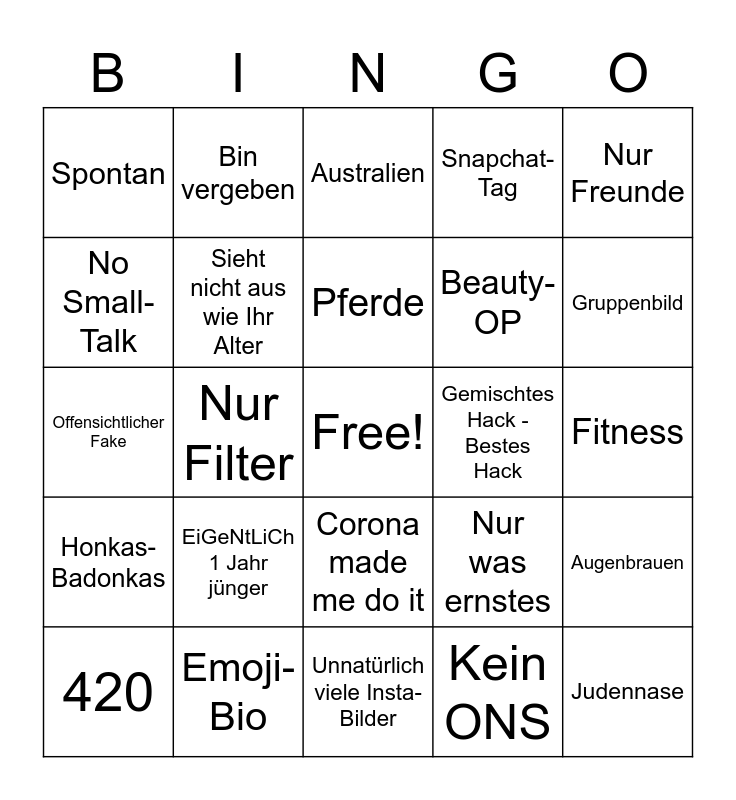 This bingo card has a free space and 42 words: Wein, Pferde, Kanada, EiGeNtLiCh 1 Jahr jünger, Kein ONS, Augenbrauen, Judennase, Größe im Profil, Australien, Corona made me do it, Fitness, Gruppenbild, Nur Filter, Nur Freunde, Gar kein Profilbild, Nur was ernstes, Travel, Offensichtlicher Fake, Name nur ein Buchstabe, Bin vergeben, No Small-Talk, Bio nur auf Englisch, Stirn, Spontan, Gesicht nicht sichtbar, Gaming, Beauty-OP, Insta-Tag, Ernährungsweise, Geschlechtsidentität, Tattoos, Honkas-Badonkas, Sieht nicht aus wie Ihr Alter, Unnatürlich viele Insta-Bilder, Buttergolem, 420, Emoji-Bio, Gemischtes Hack - Bestes Hack, Keine Bio, Nur ein Bild, Snapchat-Tag and „Philosophie“.