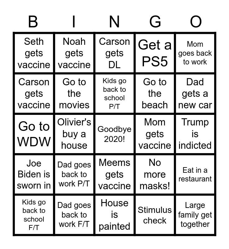 This bingo card has a free space and 24 words: Dad goes back to work P/T, Dad goes back to work F/T, Kids go back to school P/T, Kids go back to school F/T, Mom goes back to work, Seth gets vaccine, Carson gets vaccine, Noah gets vaccine, Mom gets vaccine, Meems gets vaccine, Go to the beach, Go to WDW, No more masks!, Eat in a restaurant, Go to the movies, Stimulus check, Trump is indicted, Carson gets DL, Dad gets a new car, Olivier's buy a house, Large family get together, Joe Biden is sworn in, Get a PS5 and House is painted.