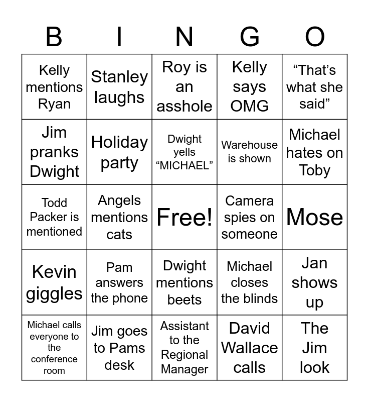 This bingo card has a free space and 24 words: Pam answers the phone, Jim goes to Pams desk, Dwight yells “MICHAEL”, Michael calls everyone to the conference room, “That’s what she said”, Kelly mentions Ryan, Jim pranks Dwight, Stanley laughs, Camera spies on someone, Dwight mentions beets, Warehouse is shown, Todd Packer is mentioned, Michael closes the blinds, Jan shows up, Holiday party, David Wallace calls, Mose, Roy is an asshole, Michael hates on Toby, Angels mentions cats, The Jim look, Kevin giggles, Kelly says OMG and Assistant to the Regional Manager.