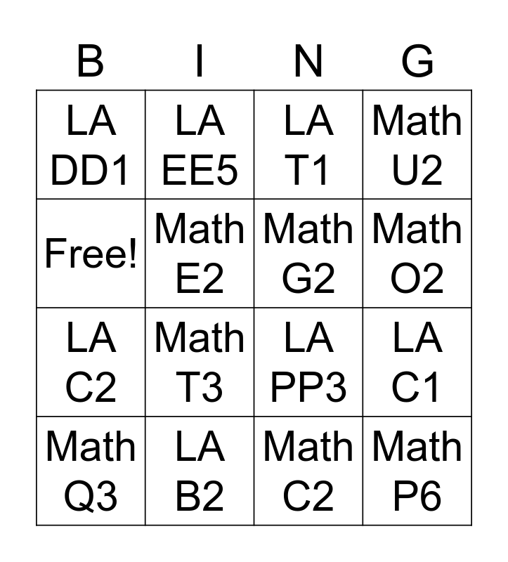 This bingo card has 16 words: LA B2, LA C1, LA T1, LA DD1, LA C2, LA EE5, LA PP3, Math C2, Free!, Math E2, Math Q3, Math U2, Math T3, Math O2, Math G2 and Math P6.