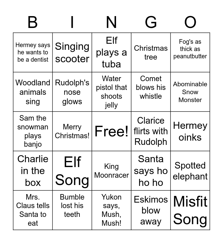 This bingo card has a free space and 29 words: Mrs. Claus tells Santa to eat, Mrs. Donner kisses Rudolph, Merry Christmas!, Santa Eats, Hermey says he wants to be a dentist, Elf plays a tuba, Rudolph's nose glows, Elf Song, Clarice flirts with Rudolph, Bumble lost his teeth, Hermey oinks, Misfit Song, Yukon says, Mush, Mush!, Eskimos blow away, Abominable Snow Monster, Polar bear cubs, King Moonracer, Charlie in the box, Fog's as thick as peanutbutter, Sam the snowman plays banjo, Santa says ho ho ho, Fireball the fawn, Comet blows his whistle, Woodland animals sing, Christmas tree, Singing scooter, Spotted elephant, Water pistol that shoots jelly and Sam the Snowman talks.
