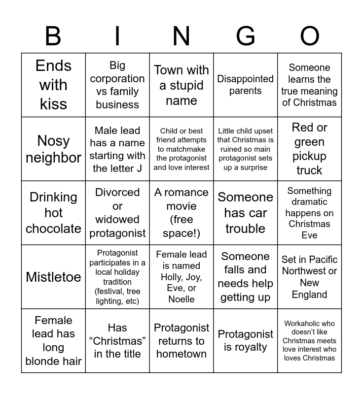 This bingo card has a free space and 30 words: Has “Christmas” in the title, Takes place in a quaint country town, Divorced or widowed protagonist, Sassy child, Ends with kiss, Town with a stupid name, Male lead has a name starting with the letter J, Female lead is named Holly, Joy, Eve, or Noelle, Someone has car trouble, Protagonist returns to hometown, Something dramatic happens on Christmas Eve, Workaholic who doesn’t like Christmas meets love interest who loves Christmas, Protagonist is royalty, Love interest is not cool at all but protagonist still falls in love, Red or green pickup truck, Flight gets cancelled, Someone falls and needs help getting up, Mistletoe, Protagonist participates in a local holiday tradition (festival, tree lighting, etc), Someone learns the true meaning of Christmas, Drinking hot chocolate, Mysterious man who may or may not be Santa, Big corporation vs family business, Little child upset that Christmas is ruined so main protagonist sets up a surprise, Nosy neighbor, Disappointed parents, Set in Pacific Northwest or New England, Female lead has long blonde hair, Child or best friend attempts to matchmake the protagonist and love interest and Interrupted first kiss.