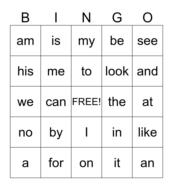 This bingo card has a free space and 24 words: by, for, to, a, see, am, his, is, the, I, look, we, in, like, me, it, at, my, and, can, an, no, be and on.