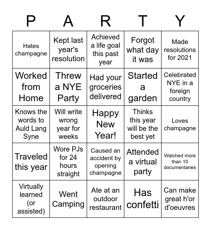 This bingo card has a free space and 30 words: Went Camping, Asleep before 12am last year, Will write wrong year for weeks, NYE is favorite holiday, Hates champagne, Achieved a life goal this past year, Threw a NYE Party, Caused an accident by opening champagne, Thinks this year will be the best yet, Ate at an outdoor restaurant, Loves champagne, Can make great h'or d'oeuvres, Has confetti, Gave yourself a haircut, Celebrated NYE in a foreign country, Slept past noon more than 3x, Attended a virtual party, Traveled this year, Wore PJs for 24 hours straight, Made resolutions for 2021, Knows the words to Auld Lang Syne, Had your temperature taken, Kept last year's resolution, Started a garden, Worked from Home, Forgot what day it was, Watched more than 10 documentaries, Virtually learned (or assisted), Had your groceries delivered and Became a zoom expert.
