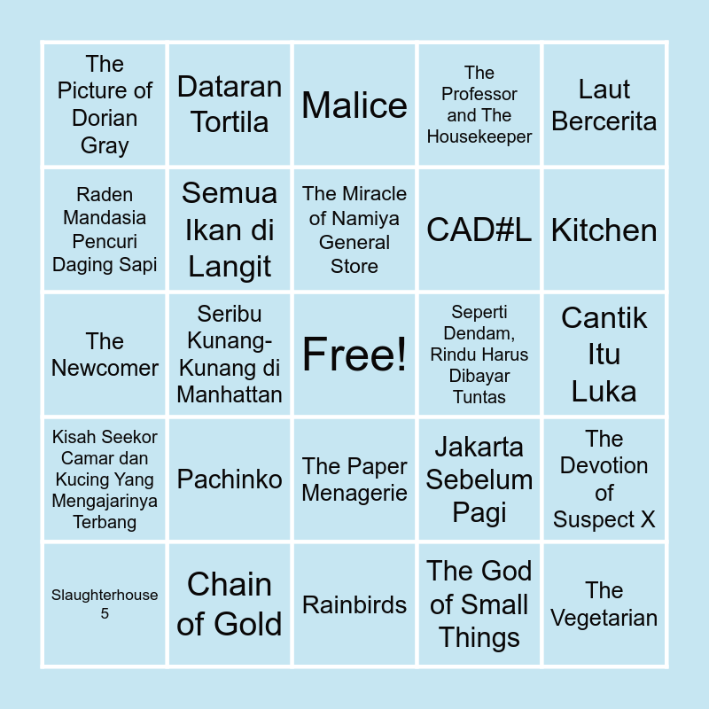 This bingo card has a free space and 24 words: Pachinko, Chain of Gold, The Miracle of Namiya General Store, Slaughterhouse 5, Laut Bercerita, The Picture of Dorian Gray, Raden Mandasia Pencuri Daging Sapi, Dataran Tortila, Seperti Dendam, Rindu Harus Dibayar Tuntas, The Paper Menagerie, CAD#L, The Newcomer, Jakarta Sebelum Pagi, The Devotion of Suspect X, Semua Ikan di Langit, The God of Small Things, Cantik Itu Luka, Malice, Kitchen, Seribu Kunang-Kunang di Manhattan, The Vegetarian, Kisah Seekor Camar dan Kucing Yang Mengajarinya Terbang, The Professor and The Housekeeper and Rainbirds.