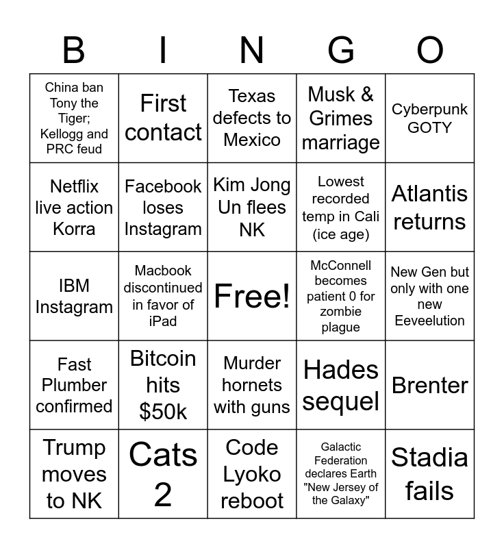 This bingo card has a free space and 24 words: Bitcoin hits $50k, Cats 2, Kim Jong Un flees NK, Trump moves to NK, Cyberpunk GOTY, China ban Tony the Tiger; Kellogg and PRC feud, Netflix live action Korra, First contact, McConnell becomes patient 0 for zombie plague, Murder hornets with guns, Lowest recorded temp in Cali (ice age), IBM Instagram, Hades sequel, Brenter, Facebook loses Instagram, Galactic Federation declares Earth "New Jersey of the Galaxy", New Gen but only with one new Eeveelution, Texas defects to Mexico, Atlantis returns, Macbook discontinued in favor of iPad, Stadia fails, Fast Plumber confirmed, Musk & Grimes marriage and Code Lyoko reboot.
