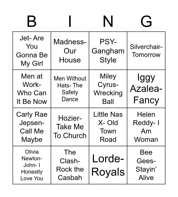 This bingo card has 24 words: Bonnie Tyler- Total Eclipse of the Heart, Styx- Mr. Roboto, Iggy Azalea- Fancy, Savage Garden- Truly Madly Deeply, Men at Work- Who Can It Be Now, Jet- Are You Gonna Be My Girl, Men Without Hats- The Safety Dance, Madness- Our House, The Clash- Rock the Casbah, Eurythmics- Sweet Dreams, Carly Rae Jepsen- Call Me Maybe, Little Nas X- Old Town Road, Fun.- We Are Young, Adele- Rolling In The Deep, Miley Cyrus- Wrecking Ball, M83- Midnight City, Lorde- Royals, PSY- Gangham Style, Hozier- Take Me To Church, Helen Reddy- I Am Woman, Olivia Newton-John- I Honestly Love You, Bee Gees- Stayin’ Alive, Silverchair-Tomorrow and Kylie Mongue- Can’t Get You Out of My Head.