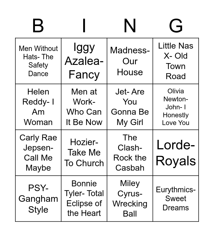 This bingo card has 22 words: Bonnie Tyler- Total Eclipse of the Heart, Styx- Mr. Roboto, Iggy Azalea- Fancy, Savage Garden- Truly Madly Deeply, Men at Work- Who Can It Be Now, Jet- Are You Gonna Be My Girl, Men Without Hats- The Safety Dance, Madness- Our House, The Clash- Rock the Casbah, Eurythmics- Sweet Dreams, Carly Rae Jepsen- Call Me Maybe, Little Nas X- Old Town Road, Fun.- We Are Young, Adele- Rolling In The Deep, Miley Cyrus- Wrecking Ball, M83- Midnight City, Lorde- Royals, PSY- Gangham Style, Hozier- Take Me To Church, Helen Reddy- I Am Woman, Olivia Newton-John- I Honestly Love You and Kylie Mongue- Can’t Get You Out of My Head.