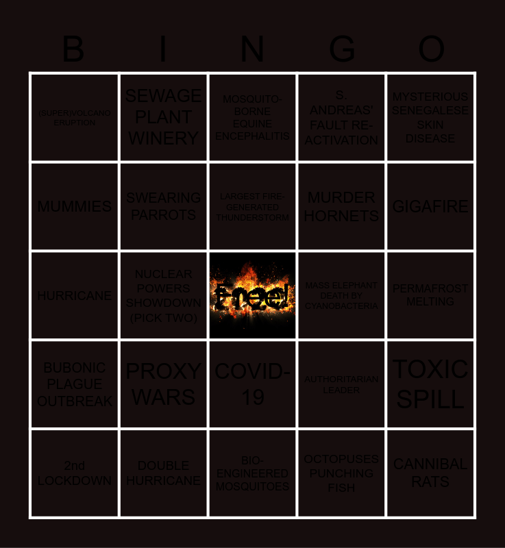 This bingo card has a free space and 90 words: UFOs/UAP, KOBE, COVID-19, POLICE BRUTALITY, EVICTION CRISIS, INTERGALACTIC RADIO BURSTS, RAINFOREST WETLANDS FIRES, RELIGIOUS ZEALOTS, BUSHFIRES, HYDROXYCLORIQUINE, LOCUSTS, WILDFIRES, ZOMBIE FIRES, PERMAFROST MELTING, POPE SLAPPING A FAITHFUL, LARGEST FIRE-GENERATED THUNDERSTORM, SOLARWINDS HACK, GOOGLE SERVICES OUTAGE, PRIMORDIAL GLACIER DETACHMENT, QUARANTINE, ZOOM FATIGUE, METHANE BUBBLES, BIO-ENGINEERED MOSQUITOES, CYCLONE, HURRICANE, DOUBLE HURRICANE, EARTHQUAKE, ROGUE SQUIRREL, STRONGES TYPHOON TO MAKE LANDFALL, LOCKDOWN, FLASH FLOOD, TOXIC SPILL, OIL TANKER SINKING, BUBONIC PLAGUE OUTBREAK, (SUPER)VOLCANO ERUPTION, S. ANDREAS' FAULT RE-ACTIVATION, MOSQUITO-BORNE EQUINE ENCEPHALITIS, ASTEROID CLOSE PASS, NUCLEAR POWERS SHOWDOWN (PICK TWO), GIGAFIRE, 2nd LOCKDOWN, MUMMIES, INFLUENTIAL CELEBRITY DEATH, AI DECODING LOST LANGUAGES (WHAT COULD GO WRONG?!?), STOCK MARKET CRASH, AUTHORITARIAN LEADER, SOCIETAL BREAKDOWN, DEADLY PANDEMIC, ORCAS RAMMING SAILBOATS, ZOMBIE STORM, COVID LONG-HAUL, MURDER HORNETS, POLITICAL ASSASSINATION BY REMOTE CONTROLLED MACHINE GUN, POLITICAL ASSASSINATION BY DRONE, POLITICAL ASSASSINATION BY NOVICHOK (ATTEMPTED), BRAIN-EATING AMOEBAS, MASS ELEPHANT DEATH BY CYANOBACTERIA, MUTANT VIRUS STRAIN, TOILET PAPER SHORTAGES, FAMINE, "DEMON SPERM" DOCTOR, ROAMING ELEPHANTS TRAMPLING CROPS, INSPIRING POLITICAL FIGURE DEATH, COVID RE-INFECTION (AFTER 6 MONTHS AT LEAST, YAY!), BUSIEST HURRICANE SEASON IN RECORDED HISTORY, DIEGO, SECOND WAVE, OCTOPUSES PUNCHING FISH, MYSTERIOUS MONOLITHS, CHAPARE VIRUS HUMAN-TO-HUMAN TRANSMISSIO, PROXY WARS, CANNIBAL RATS, MYSTERY SEEDS, DRUNK SQUIRREL, SEWAGE PLANT WINERY, SWEARING PARROTS, GOAT INVASION, LGBTQ PENGUIN EGG THEFT, DOG ELECTED AS MAYOR, MONKEYS STEALING COVID-19 BLOOD SAMPLES, MOTHPOCALYPSE, MYSTERIOUS SENEGALESE SKIN DISEASE, ZOMBIE MINKS, THIRD WAVE, BOMB CYCLONE, BOMB SNOWSTORM, FROG CELL XENOBOTS, ANDHRA PRADESH MYSTERY ILLNESS, NIGHTTIME FIREBALL and AMMONIUM NITRATE WAREHOUSE MASSIVE EXPLOSION.