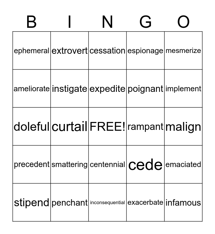 This bingo card has a free space and 40 words: bane, doleful, garish, instigate, penchant, centennial, expedite, gratuitous, mesmerize, precedent, curtail, espionage, infamous, malign, rampant, smattering, decrepit, ephemeral, ambivalent, cessation, emaciated, exacerbate, poignant, ameliorate, circumvent, condone, diminutive, expendable, repast, exodus, inter, stipend, adjacent, cede, implement, inconsequential, prohibitive, buffoon, extrovert and equilibrium.