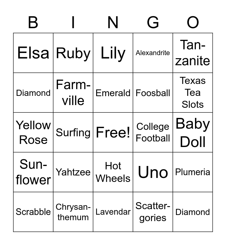 This bingo card has a free space and 34 words: Peony, Scatter- gories, Moto- Cross, Snow Boarding, Sun- flower, Farm-ville, Tan-zanite, Scrabble, Ruby, Rose, Emerald, Lily, Football, Chess, College Football, Texas Tea Slots, Chrysan-themum, Yellow Rose, Yahtzee, Uno, Hot Wheels, Legos, Elsa, Baby Doll, Lavendar, Diamond, Alexandrite, Abalone, Foosball, Diamond, Yellow Rose, Surfing, Plumeria and Basketball.