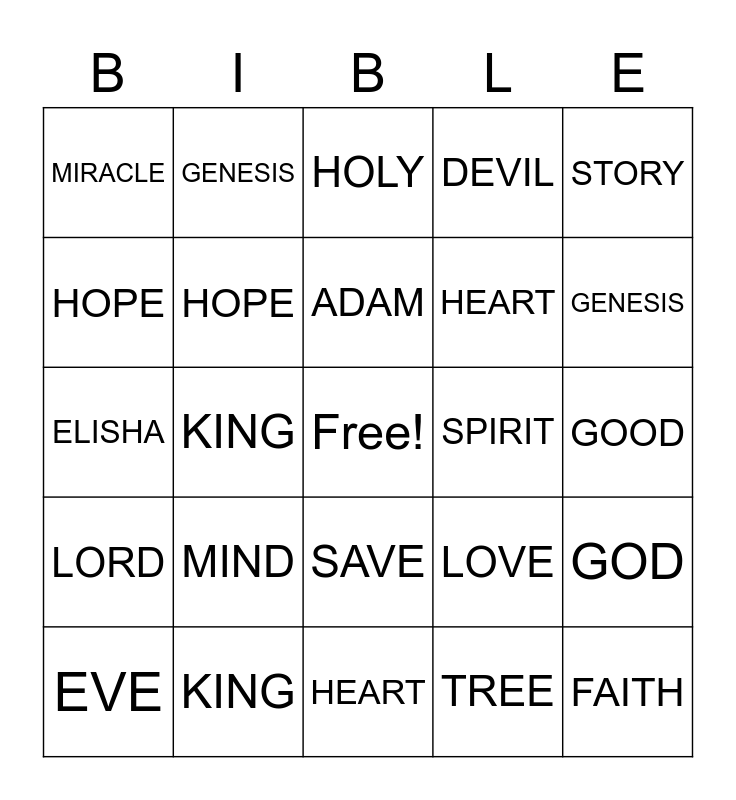 ⚠ This card has duplicate items: SAINT (2), FAITH (2), HELP (2), SIN (2), CHRIST (2), TREE (2), GENESIS (2), SON (2), ADAM (2), ELISHA (2), SAVE (2), EDEN (2), GOOD (2), STORY (2), BIBLE (2), HOPE (2), KING (2), MIRACLE (2), SACRIFICE (2), MIND (2), HEART (2), LOVE (2), LORD (2), BELIEF (2), FATHER (2), CREATION (2), SPIRIT (2), HEBREW (2), GOD (2), JESUS (2), HOLY (2), EVE (2), SATAN (2)