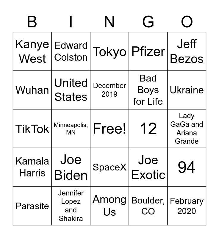 This bingo card has a free space and 24 words: Joe Biden, Jennifer Lopez and Shakira, December 2019, Parasite, Jeff Bezos, Kanye West, Wuhan, Edward Colston, 12, SpaceX, Bad Boys for Life, TikTok, Joe Exotic, 94, United States, Boulder, CO, Lady GaGa and Ariana Grande, Tokyo, Ukraine, Minneapolis, MN, February 2020, Kamala Harris, Pfizer and Among Us.