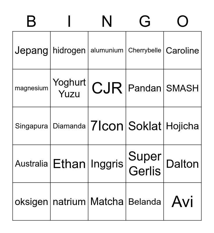 This bingo card has 25 words: Ethan, Matcha, CJR, oksigen, Caroline, Jepang, magnesium, hidrogen, Soklat, Inggris, Pandan, Singapura, Super Gerlis, Dalton, Yoghurt Yuzu, Avi, Hojicha, alumunium, SMASH, Diamanda, 7Icon, natrium, Australia, Cherrybelle and Belanda.