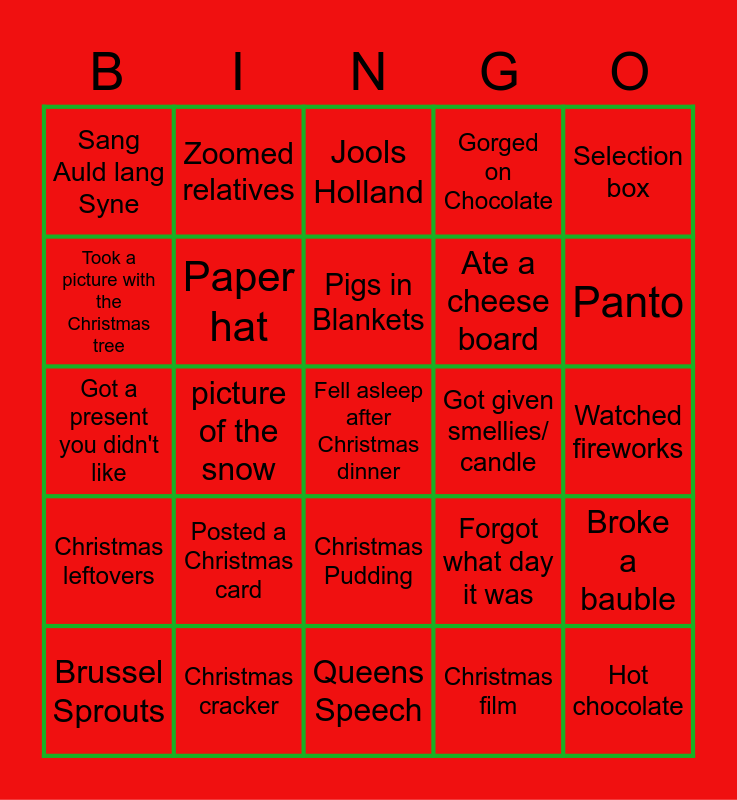 This bingo card has a free space and 29 words: Brussel Sprouts, Mince Pie, picture of the snow, Christmas PJs, Sang Auld lang Syne, Jools Holland, Paper hat, Posted a Christmas card, Got given smellies/ candle, Christmas cracker, Watched fireworks, Hot chocolate, Queens Speech, Christmas film, Panto, Boxing Day walk, Christmas Pudding, Christmas leftovers, Selection box, Got a present you didn't like, Forgot what day it was, Presents in a stocking, Ate a cheese board, Took a picture with the Christmas tree, Gorged on Chocolate, Zoomed relatives, Broke a bauble, Pigs in Blankets and Gifted something home made.