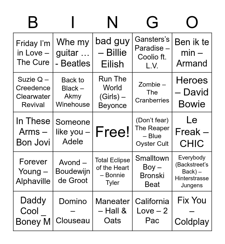 This bingo card has a free space and 32 words: California Love – 2 Pac, the winner takes it all – Abba, Someone like you – Adele, Dream On – Aerosmith, Forever Young – Alphaville, Back to Black – Akmy Winehouse, Ben ik te min – Armand, Everybody (Backstreet’s Back) – Hinterstrasse Jungens, Whe my guitar … - Beatles, Stayin’Alive – Bee Gees, Run The World (Girls) – Beyonce, bad guy – Billie Eilish, Love really hurts without You – Billy Ocean, Where is the Love? - Black Eyes Peas, (Don’t fear) The Reaper – Blue Oyster Cult, Buffalo Soldier _ Bob Marley, Daddy Cool _ Boney M, In These Arms – Bon Jovi, Total Eclipse of the Heart – Bonnie Tyler, Avond – Boudewijn de Groot, Smalltown Boy – Bronski Beat, Dancing in the Dark – Bruce Springsteen, Le Freak – CHIC, Domino – Clouseau, Fix You – Coldplay, Gansters’s Paradise – Coolio ft. L.V., Zombie – The Cranberries, Suzie Q – Creedence Clearwater Revival, Friday I’m in Love – The Cure, Maneater – Hall & Oats, Space Oddity – David Bowie and Heroes – David Bowie.