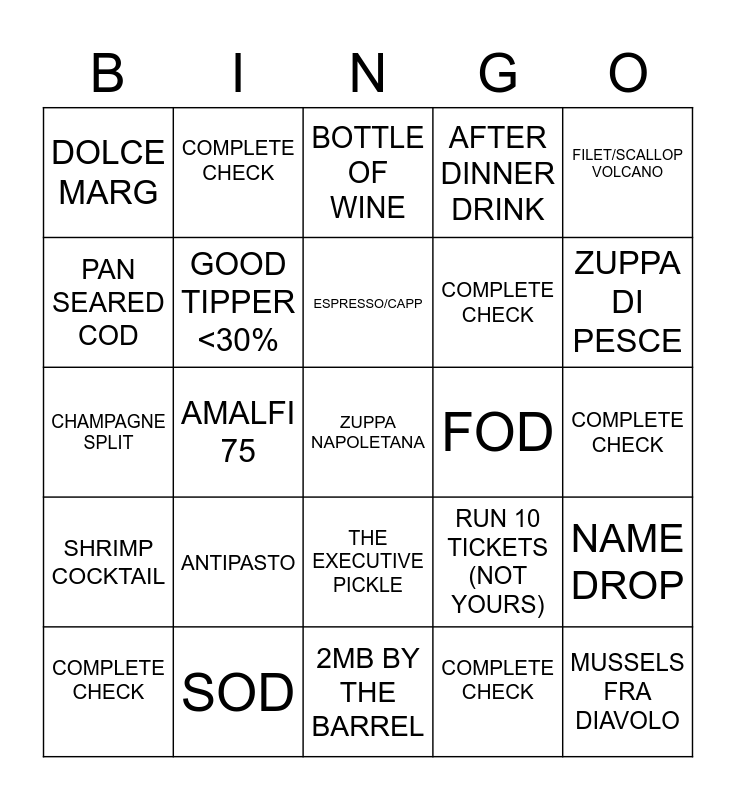 This bingo card has 25 words: ANTIPASTO, 2MB BY THE BARREL, ESPRESSO/CAPP, COMPLETE CHECK, FILET/SCALLOP VOLCANO, DOLCE MARG, PAN SEARED COD, COMPLETE CHECK, FOD, THE EXECUTIVE PICKLE, COMPLETE CHECK, CHAMPAGNE SPLIT, RUN 10 TICKETS (NOT YOURS), NAME DROP, GOOD TIPPER <30%, MUSSELS FRA DIAVOLO, COMPLETE CHECK, BOTTLE OF WINE, ZUPPA DI PESCE, AMALFI 75, ZUPPA NAPOLETANA, SOD, SHRIMP COCKTAIL, AFTER DINNER DRINK and COMPLETE CHECK.