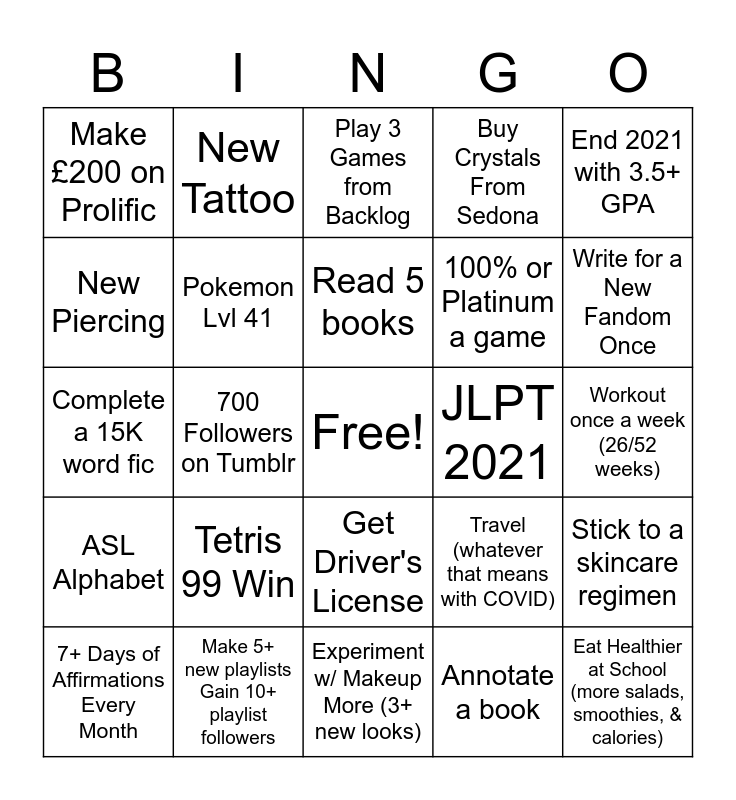 This bingo card has a free space and 24 words: Tetris 99 Win, Make 5+ new playlists Gain 10+ playlist followers, Read 5 books, 7+ Days of Affirmations Every Month, End 2021 with 3.5+ GPA, Make £200 on Prolific, New Piercing, New Tattoo, JLPT 2021, Get Driver's License, 100% or Platinum a game, Complete a 15K word fic, Travel (whatever that means with COVID), Stick to a skincare regimen, Pokemon Lvl 41, Annotate a book, Workout once a week (26/52 weeks), Play 3 Games from Backlog, Write for a New Fandom Once, 700 Followers on Tumblr, Eat Healthier at School (more salads, smoothies, & calories), ASL Alphabet, Buy Crystals From Sedona and Experiment w/ Makeup More (3+ new looks).