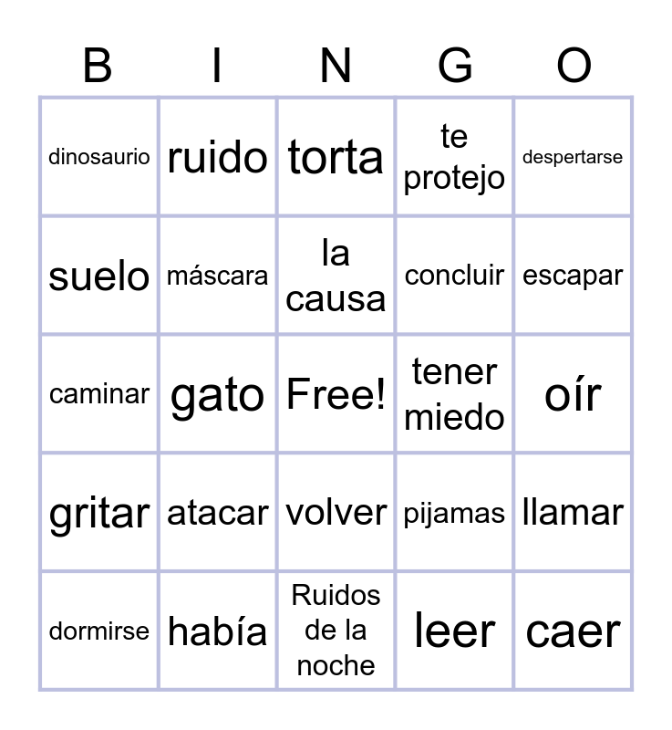 This bingo card has a free space and 31 words: Ruidos de la noche, BINGO, gato, planta, dinosaurio, torta, máscara, pijamas, tener miedo, leer, oír, caer, policia, ladrón/criminal, escapar, periódico, llamar, atacar, gritar, volver, despertarse, acostarse, dormirse, ruido, concluir, suelo, te protejo, caminar, había, la causa and cocina.