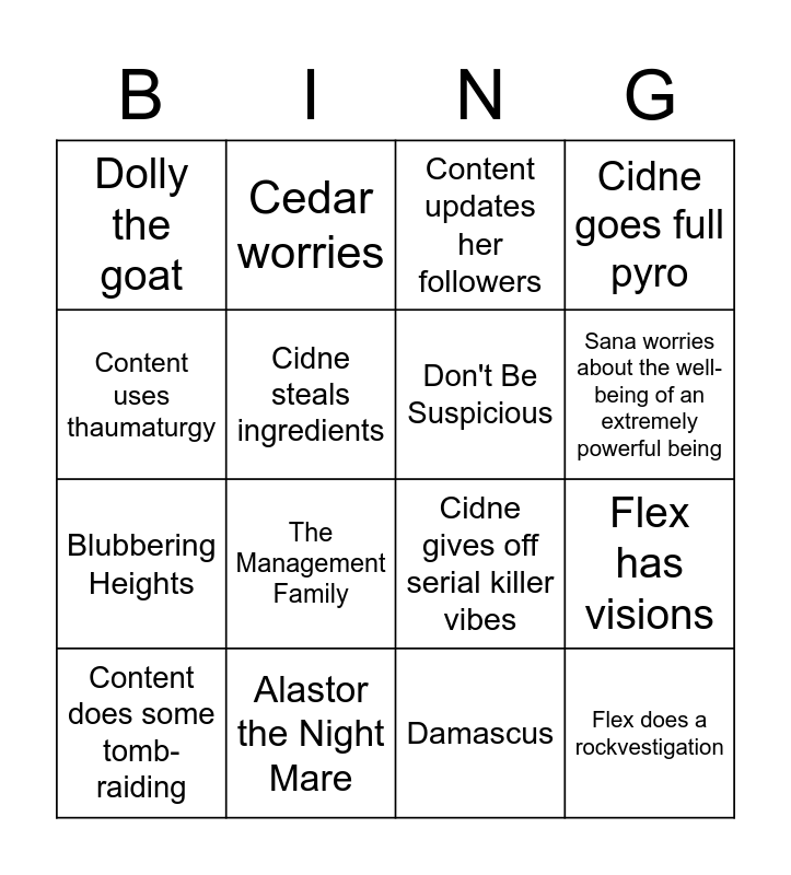 This bingo card has 23 words: Flex does a rockvestigation, Unexpected body modifications, Sana worries about the well-being of an extremely powerful being, Jordan rolls a 2, Content uses thaumaturgy, Dolly the goat, Cidne steals ingredients, Cedar worries, Content does some tomb-raiding, Flex & Sana team up using bro-bismuth, The Management Family, Blubbering Heights, Content is the Mom, Jethro's parents make poor life choices, Alastor the Night Mare, Cidne fails at stealth, Content updates her followers, Cidne gives off serial killer vibes, Don't Be Suspicious, Flex has visions, Cidne goes full pyro, Damascus and Zelus tries to get someone to sign a contract.