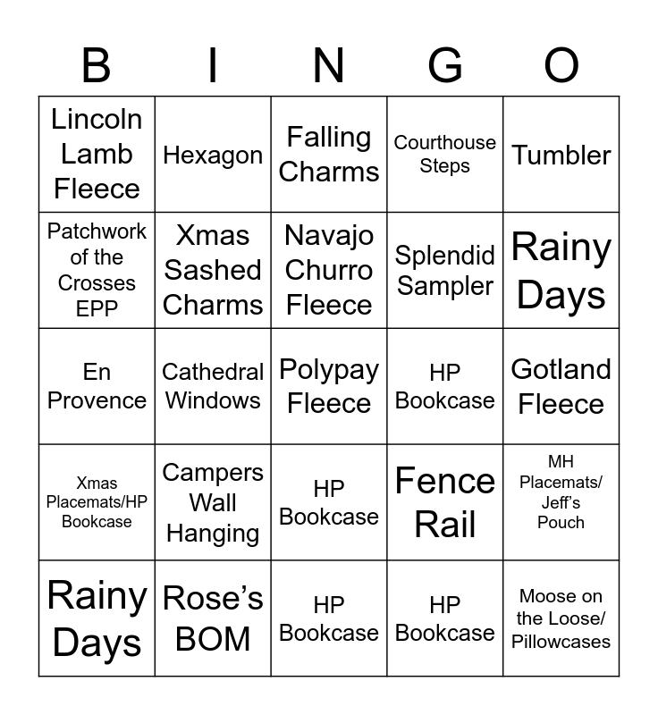 This bingo card has 25 words: Campers Wall Hanging, HP Bookcase, Navajo Churro Fleece, Rainy Days, Tumbler, Lincoln Lamb Fleece, Patchwork of the Crosses EPP, Hexagon, HP Bookcase, HP Bookcase, Splendid Sampler, En Provence, Fence Rail, MH Placemats/ Jeff’s Pouch, Xmas Sashed Charms, Moose on the Loose/ Pillowcases, Gotland Fleece, Falling Charms, Rainy Days, Cathedral Windows, Polypay Fleece, Rose’s BOM, Xmas Placemats/HP Bookcase, Courthouse Steps and HP Bookcase.