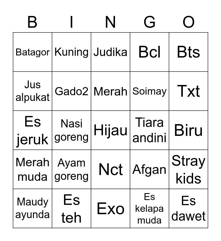 This bingo card has a free space and 24 words: Ayam goreng, Es teh, Merah, Maudy ayunda, Bts, Batagor, Jus alpukat, Kuning, Tiara andini, Nct, Soimay, Es jeruk, Afgan, Stray kids, Gado2, Es kelapa muda, Biru, Judika, Txt, Nasi goreng, Es dawet, Merah muda, Bcl and Exo.