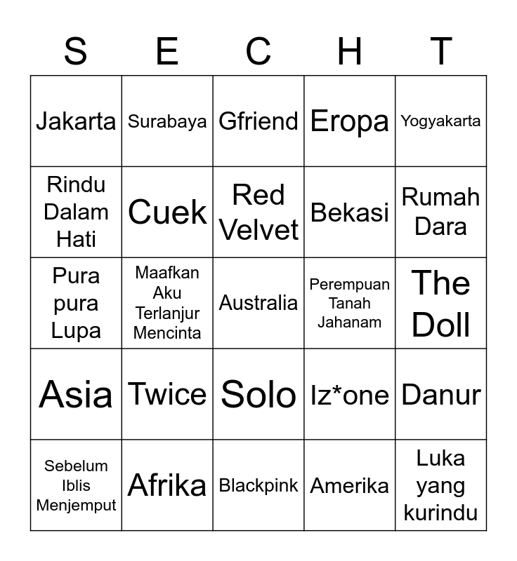 This bingo card has 25 words: Twice, Blackpink, Red Velvet, Sebelum Iblis Menjemput, Yogyakarta, Jakarta, Rindu Dalam Hati, Surabaya, Perempuan Tanah Jahanam, Solo, Bekasi, Pura pura Lupa, Iz*one, Danur, Cuek, Luka yang kurindu, The Doll, Gfriend, Rumah Dara, Maafkan Aku Terlanjur Mencinta, Australia, Afrika, Asia, Eropa and Amerika.
