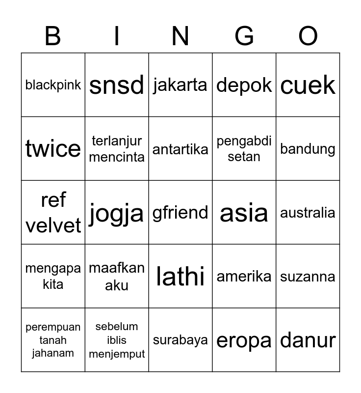 This bingo card has a free space and 24 words: maafkan aku, sebelum iblis menjemput, antartika, perempuan tanah jahanam, cuek, blackpink, twice, snsd, asia, lathi, pengabdi setan, ref velvet, amerika, suzanna, terlanjur mencinta, eropa, australia, jakarta, bandung, jogja, danur, mengapa kita, depok and surabaya.