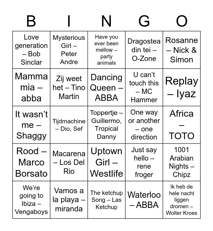 This bingo card has 97 words: Free!, Het is een nacht – Guus Meeuwis, Casanova – Ultimate Kaos, Tijdmachine – Dio, Sef, Rainbow in the sky – Paul Elstak, Fuifje – DoeMaarDave, Links Rechts – Snollebollekes, Viva La Vida – Coldplay, Crazy in love - Beyoncé, Jay-Z, Got 2 Luv U – Sean Paul, Thrift Shop – Macklemore, Dromendans – Vinzzent, Que Si, Que No – Jody Bernal, Rood – Marco Borsato, Anne – Clouseau, Love generation – Bob Sinclar, Rosanne – Nick & Simon, Maak me gek – Gerard Joling, Oya Lélé - K3, Ademnood – Linda Roos en Jessica, Stupid – Tess, Leef - André Hazes, Wannabe – Spice Girls, Barbie Girl – Aqua, I want it that way – Backstreetboys, Dancing Queen – ABBA, We’re going to Ibiza – Vengaboys, 1001 Arabian Nights – Chipz, Every time we touch – Cascada, Dromen zijn bedrog – Marco Borsato, Zij weet het – Tino Martin, Dragostea din tei – O-Zone, Kabouterdans – Kabouter Plop, Cotton Eye Joe – Rednex, The ketchup Song – Las Ketchup, Uptown Girl – Westlife, Step Right Up – Jamai, Ik neem je mee – Gers Pardoel, Mambo No. 5 – Lou Bega, It wasn’t me – Shaggy, Dansplaat – Brainpower, Africa – TOTO, Wake me up before you go-go – Wham!, Waterloo – ABBA, Macarena – Los Del Rio, Ik heb de hele nacht liggen dromen – Wolter Kroes, Single Ladies - Beyoncé, Dura – Daddy Yankee, Even aan mijn moeder vragen – Bloem, Hero – Enrique Iglesias, Temperature – Sean Paul, What makes you beautiful – One Direction, What is love – Haddaway, Walk on water – Milk Inc., Narcotic – Liquido, Alane – Wes, Thriller – Micheal Jackson, Mysterious Girl – Peter Andre, Let’s get loud – Jennifer Lopez, Bewegen is gezond – kinderen voor kinderen, Jailhouse rock – Elvis Presley, Stayin’Alive - Bee Gees, Get Spanish – Jeugd van tegenwoordig, Ai se eu te pego – Michel Teló, Zij – Marco Borsato, Greased Lightning – John Travolta, Ik wou dat ik jou was – veldhuis en kemper, Rhytm is a dancer – SNAP!, La bomba – King Africa, Vamos a la playa – miranda, U can’t touch this – MC Hammer, ABC – The Jackson 5, Désenchantée - Kate Ryan, Walking on sunshine – Katrina & the waves, Mi Rowsu – Damaru, Jan smit, The tide is high – Atomic Kitten, Salsa Tequila – Anders Nilsen, September – Earth, wind & fire, One way or another – one direction, Lay all your love on me – ABBA, Beautiful – Akon, Replay – Iyaz, Unwritten – Natasha Bedingfield, Country Roads – Hermes Houseband, De Toreador – Opgeblazen, Wilbert Pigmans, Je hoeft niet naar huis vannacht – Marco Borsato, Toppertje – Guillermo, Tropical Danny, I gotta feeling – Black Eyed Peas, Follow the leader – the soca boys, Heb je even voor mij – frans bauer, Have you ever been mellow – party animals, Viva hollandia – wolter kroes, Waka waka – shakira, Just say hello – rene froger, Mamma mia – abba, Laat de zon in je hart – rene schuurmans and Livin' la vida loca – ricky martin.