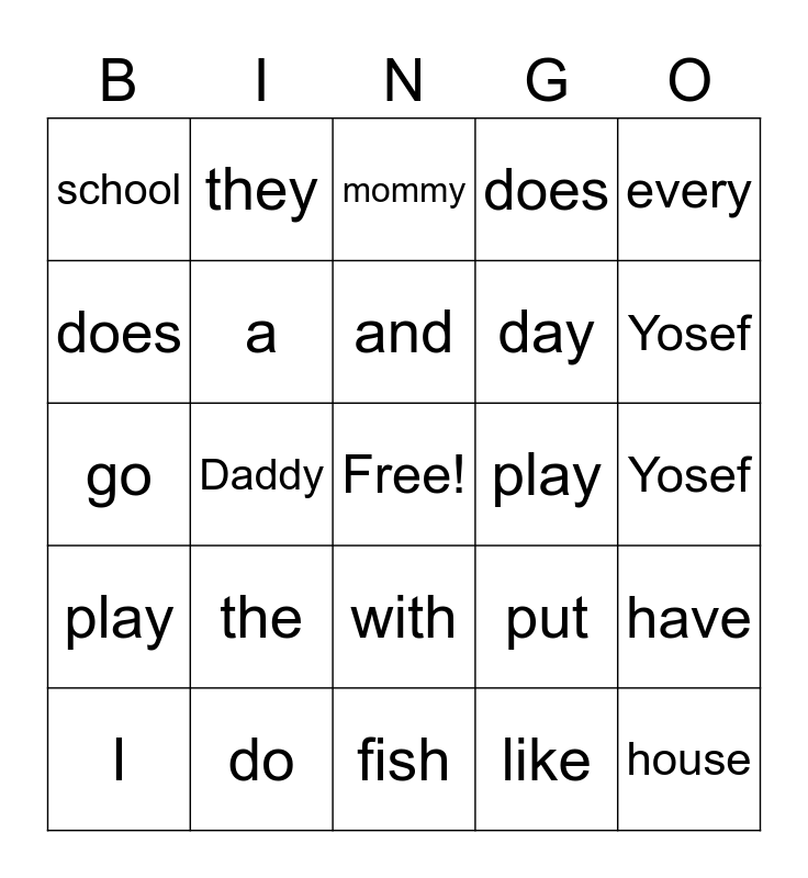 This bingo card has a free space and 24 words: the, do, and, I, every, school, does, they, play, with, day, go, put, have, a, like, Yosef, mommy, Yosef, Daddy, house, play, does and fish.